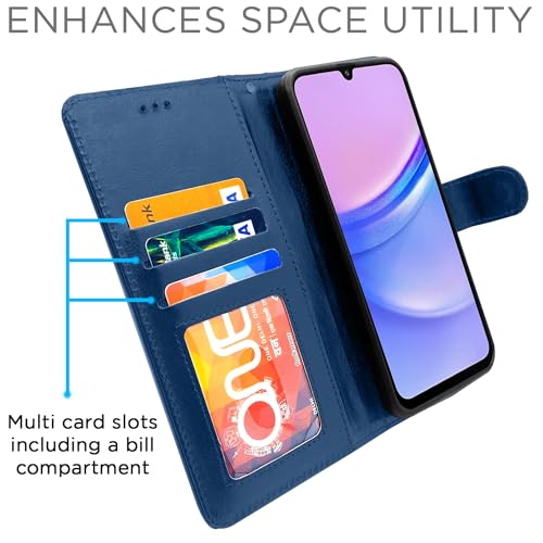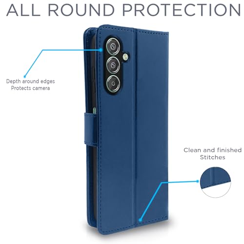 Invest in your brand new Samsung Galaxy F15 5G device’s protection today through this fit to use executive Blue leather stand wallet case flip cover and save yourself from the heartbreak and agony of watching the scratches and damages on your device multiply periodically. This sleek executive flip cover case is designed to a perfect fit on your mobile and smooth surface further adds to its polished looks. This pouch comes with inner shell back cover that does not break easily and aids in shock absorption during impacts. This wallet case comes with card slots to store receipts, cards or emergency cash. You can now video chat or watch movies hands free in landscape mode with the wallet stand. Perfect and precise cutouts allow easy access to all ports.