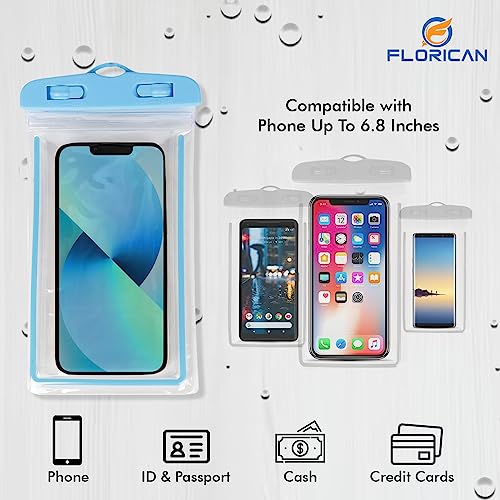 Universal size waterproof case dry bag, fits all smartphones up to 6.7 inches and 4 inches wide; Also can be protection for your ID, cash, credit cards, passport, keys.