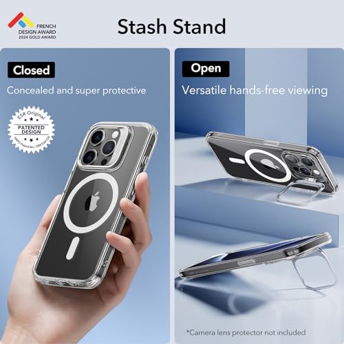 Adjustable Stash Stand: positioned around camera frame to stay hidden when folded away while keeping MagSafe ring 100% unobstructed; enjoy a freely adjustable and stable view for watching shows whenever, wherever